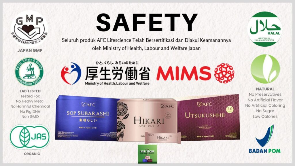 SOP Subarashi, Utsukushhii, dan Hikari merupakan produk Makanan Kesehatan (Health Food / Nutraceutical) yang diproduksi dengan standar farmasi Jepang. Produk ini bukan obat dan tidak dimaksudkan untuk menggantikan diagnosis, pengobatan, maupun resep dari tenaga medis profesional. Produk digunakan sebagai pendamping nutrisi (komplementer) dalam mendukung fungsi tubuh secara menyeluruh.